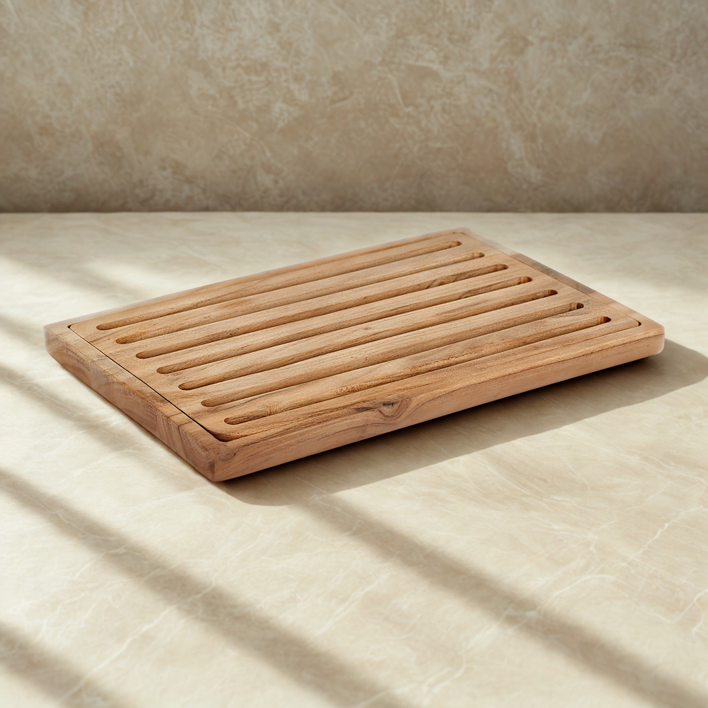 Crafted from warm, natural wood, its smooth finish and visible grain patterns give it a timeless and organic aesthetic, making it a stylish addition to any kitchen or dining table. The elongated slots on the top surface are both decorative and functional, allowing crumbs to neatly fall through to the tray below, keeping counters clean and reducing mess.